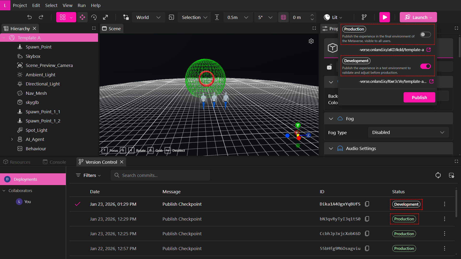 - Production — Publish the experience to the live Metaverse, visible to all users. The Verses tab always reflects the currently deployed Production version.